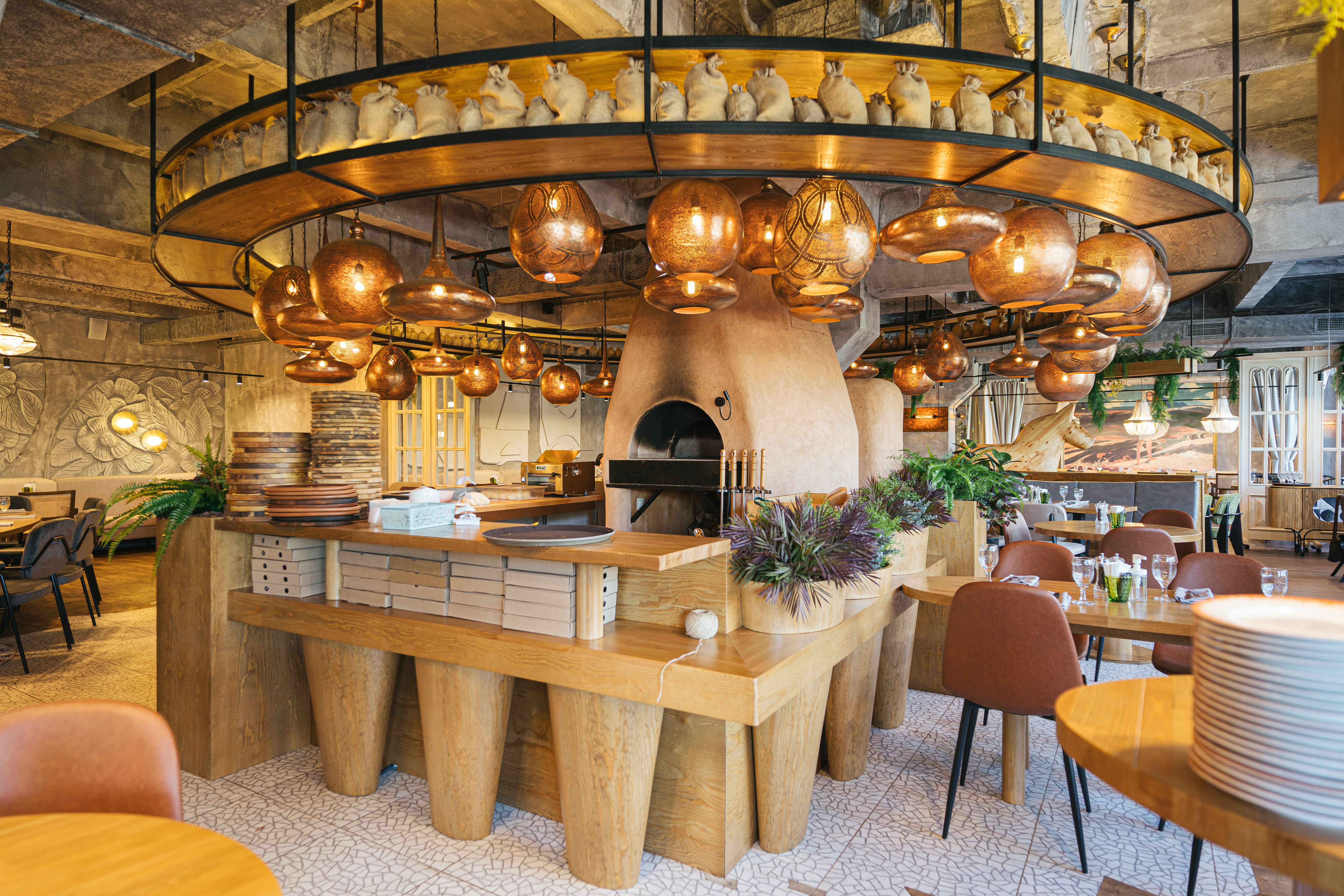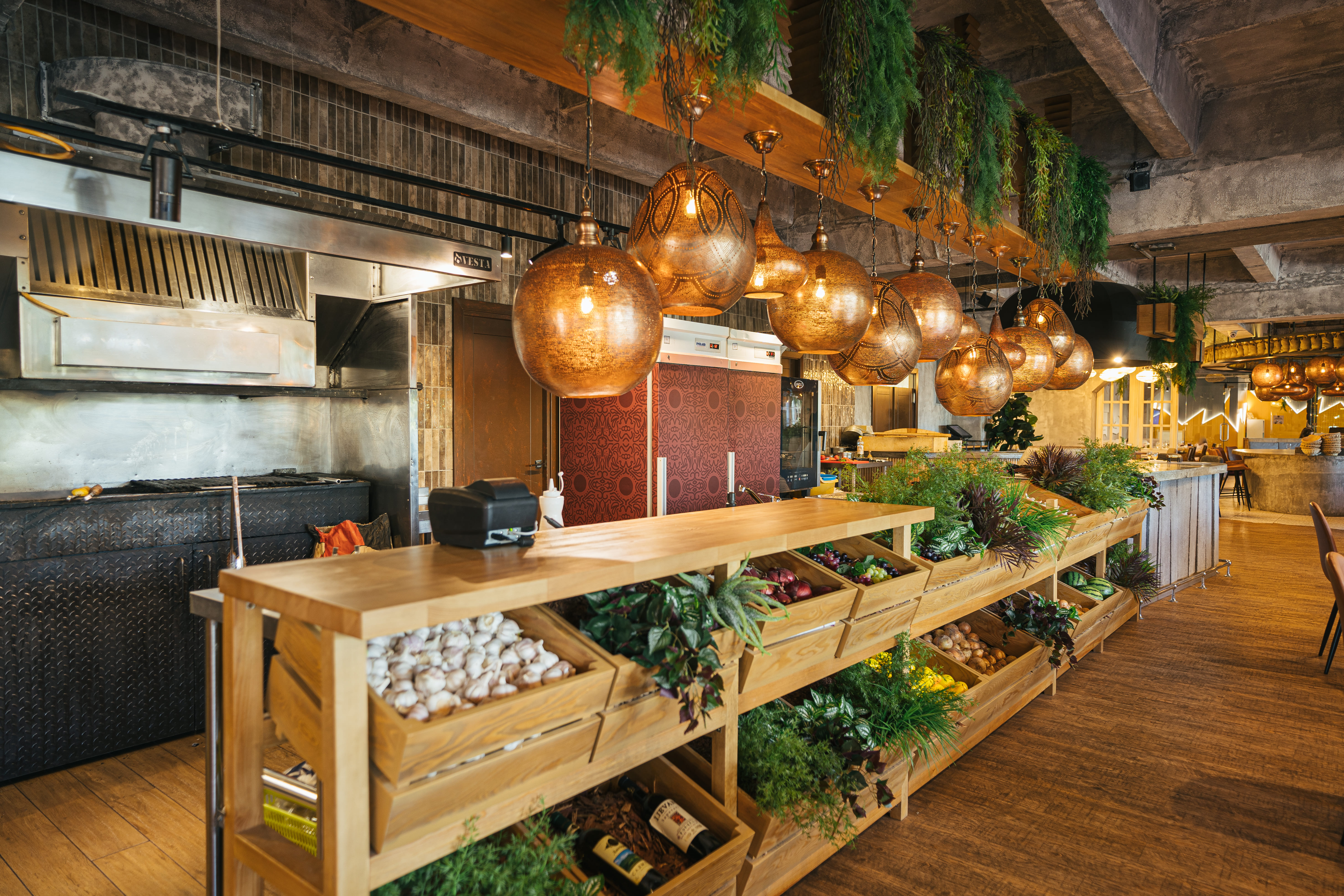 Все процессы, которые происходят на кухне ресторана, открыты для глаз гостей. Сердце большой и открытой кухни является дровяная печь для пиццы, изготовленная по специальному заказу компанией The Elements.